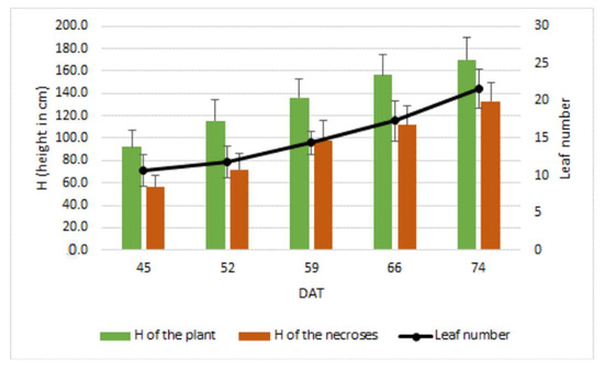 Evolution of autonecroses in the IGSV plants during one month after transplant. The figure reports the height (H) of the plants, the height (H) of the necroses in the plants, and the highest leaf number displaying the necroses (mean ± SD); DAT: Day After Transplant.