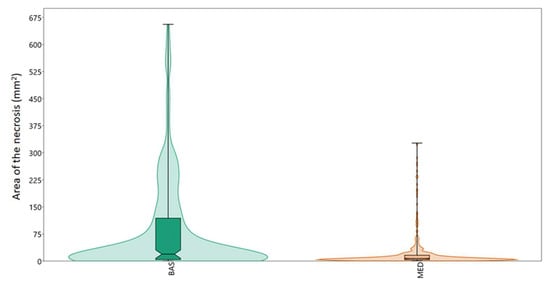 Violin and bar diagram showing the distribution and the amount of the necroses in terms of foliar area (mm2) in the basal (BAS) and median leaves (MED) of the IGSV plants (67 DAT). The horizontal line inside the box represents the median.