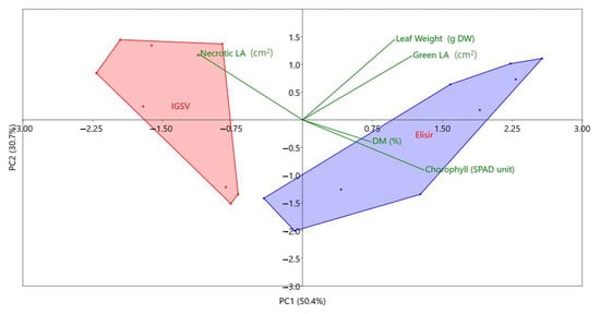 The analysis of Specific LA highlighted the effect of the autonecrotic phenomenon. In the control, the Specific LA decreased moving from basal to apical leaves, whereas in IGSV, the trend was the opposite, leading to the lack of a statistical difference between the apical (green) leaves of Elisir and the basal (necrotic) leaves of IGSV. The comparison of leaf traits between the mutant and the control genotype revealed the peculiarity of the former (Figure 8). The first two components of PCA explain more than 80 percent of the existing variability at the leaf level, highlighted by the opposite position of the vectors relating to necrotic leaf area (shifted toward IGSV) and chlorophyll content (close to Elisir).