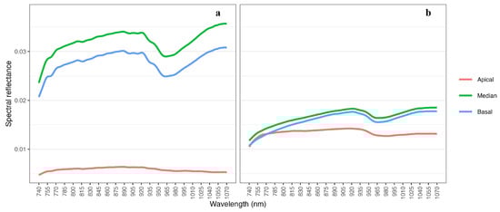 Average curves of spectral reflectance of basal, median, and apical leaves of the control (a) and the IGSV mutant (b). Analysis at the stage of 20th true leaf (67 DAT).