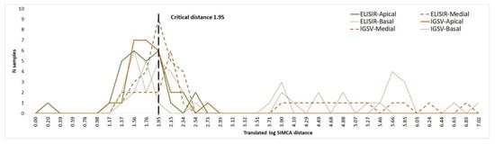 Figure 11 shows the SIMCA model applied to the dataset of 54 apical and median leaves’ Elisir samples and applied to the remaining 108 leaves’ samples (162 total samples). The SIMCA logarithmic translational critical distance obtained from the model was 1.95. This figure identifies the boundary between the healthy and unhealthy plants. Only the control plant (Elisir) and the apical leaves of IGSV were represented with values below the critical distance. This means that values below the critical distance are included in the model of healthy plants, while those above the critical distance (i.e., rejected by the model as being healthy) indicate diseased plants, and the more the distance increases above the critical distance, the less healthy the plants are. Table 4 shows the number of tomato plant samples accepted by the model. The sensitivity of the model is 72.09%. The model recognises almost all the apical leaves of Elisir (n. 24 or 88.9%), rejecting only three. Median and basal leaves are also accepted (n. 18 and n. 15 again for the cultivar Elisir, i.e., 66.7% and 55.6%) as well as the IGSV apical (n. 22 i.e., 81.5%) for which only five were rejected. The proportion of accepted was the lowest for the median (29.6%) and basal (33.4%) leaves of IGSV. In both the training and testing phases, the leaves of Elisir were almost all accepted by the model (except for three); the leaves of IGSV were also accepted, although in the latter, the percentage of diseased was higher than in Elisir.