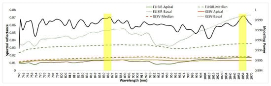 Figure 12 shows the modelling power of the SIMCA model applied to the VIS/NIR spectral bands, indicating which bands made a greater contribution to the identification of healthy plants. Although all spectral bands contributed excellently to the model, as shown in Figure 12, it is evident that the values with the greatest modelling power are those between 860–870 nm and those between 1050 and 1060 nm.