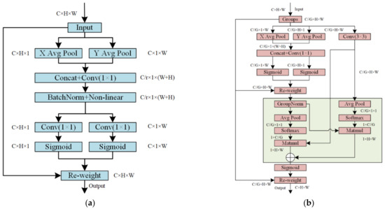 The structure of the CA attention mechanism and the EMA attention mechanism. (a) CA attention mechanism structure and (b) EMA attention mechanism structure.