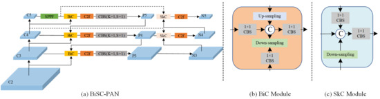 As the intermediary segment of both the backbone and the head, the neck network bears the crucial task of amalgamating features with disparate resolutions from the backbone and augmenting the expressive capacity of output features. Its significance within the network architecture has been substantiated, potentially surpassing even the importance of the backbone [40,41,42]. The Feature Pyramid Network achieves multi-scale feature fusion through the incorporation of a top-down pathway. In the Path Aggregation Network, a bottom-up pathway is introduced in addition to the top-down pathway, effectively curtailing the information transmission distance between lower and upper-level features. This adjustment facilitates a smoother transmission of bottom-level information to upper-level features. Bidirectional Cross-Scale Connections and Weighted Feature Fusion (BIFPN) eliminate singular-output edge nodes that provide minimal contributions to fusion within the framework of the path aggregation network. Additionally, a jump link is introduced between the original input and output nodes at the same level. In a similar vein, RepBi-PAN introduces a bidirectional connection (BiC) module aiming to integrate feature maps from adjacent layers. This approach enhances the accurate retention of positioning signals, thereby improving the precision of localizing small targets.