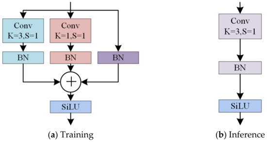 Structural reparameterization technology involves the creation of a series of structures designed for training purposes. Subsequently, it entails the transformation of the trained parameters into another set of parameters during the reasoning phase, thereby achieving an equivalent transformation of the overall structure. In the case of ACNet [43], the network replaces every 3 × 3 convolution with a 3 × 1 convolution, 1 × 3 convolution, and 3 × 3 convolution during the training stage. Subsequently, the outcomes of the three convolution layers are aggregated to derive the convolution layer’s final output. During the inference phase, the three convolutional cores undergo fusion. Ding et al.’s RepVGG [44], leveraging structural reparameterization technology, has contributed to the revival of the VGG single-path minimalist architecture. In the course of training, parallel 1 × 1 convolution branches and identity mapping branches are added into each 3 × 3 convolution layer. Subsequently, during inference, the three branches are amalgamated to a unified 3 × 3 convolution layer. Motivated by the concepts discussed above, this study adopts the RepConv Block as a substitution for the 3 × 3 CBS Block. In the training phase, the RepConv Block is employed, featuring multiple branches to facilitate the training process. In the inference phase, each RepConv Block undergoes transformation into a 3 × 3 CBS Block. The RepConv Block structure is shown in Figure 5.