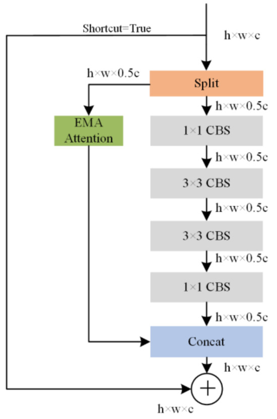 The network’s detection performance is influenced to a certain extent by the number of convolutional channels. Taking the YOLO series networks as an illustration, standard network structures denoted as s, m, l, and x typically exhibit a higher channel count compared to their lightweight counterparts. Nevertheless, the augmentation in the quantity of channels is frequently concomitant with an elevation in both the parameters and FLOPs. Consequently, this study initiates an exploration into whether a structure can be devised to sustain network performance while concurrently reducing the channel count. The Bottleneck, a pivotal component of the C2f Block, is recurrently employed throughout the network. Its parameters and FLOPs have a direct impact on the overall network’s parameters and FLOPs. To enhance the network’s lightweight characteristics, this paper integrates the concept of the residual structure, resulting in the redesign of the Bottleneck termed the Residual EMA-Bottleneck, as delineated in Figure 7. Primarily, the input flow of the Bottleneck undergoes a split operation, segmenting the original input flow into two equal parts. Subsequently, one of the parts traverses two 3 × 3 CBS Blocks for feature extraction, while the other concentrates on local features solely through an EMA attention mechanism module. Finally, the two outputs are stacked to form the ultimate output.