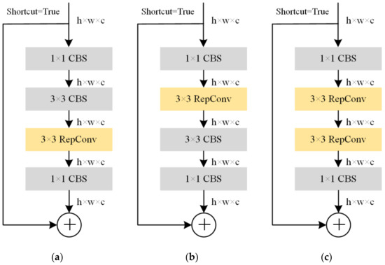Three distinct reparameterization structures. (a) Replace the CBS Block below the C2f Block with the RepConv Block. (b) Replace the CBS Block above the C2f Block with the RepConv Block. (c) Replace all CBS Blocks in the C2f Block with the RepConv Block.