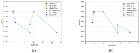 Comparison of lightweight networks. (a) Relationship curve between mAP and FLOPs and (b) Relationship curve between mAP and parameters.