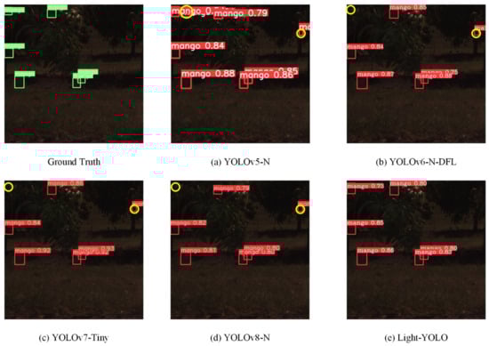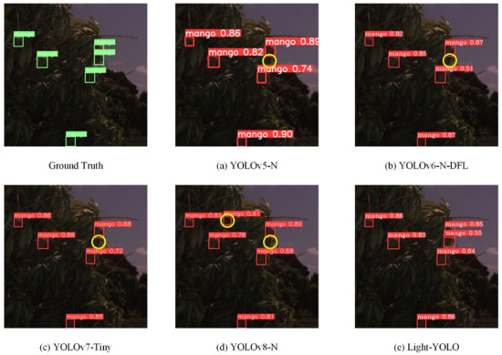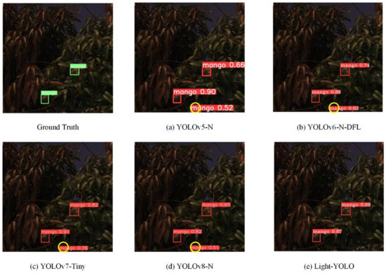 To further substantiate the practical detection efficacy of the Light-YOLO model, the test set images underwent detection using the optimal weights derived from training. During the detection process, the confidence threshold and intersection ratio were set at 0.5 and 0.3, respectively. Simultaneously, the detection performance of four models—YOLOv5-N, YOLOv6-N-DFL, YOLOv7-tiny, and YOLOv8-N—was assessed under identical parameters. Three images were specifically chosen for visualization. As shown in Figure 11, it becomes evident that other YOLO algorithms erroneously identify the area as mango due to the similar color of the bottom area, whereas Light-YOLO accurately discerns that the region is not mango. As shown in Figure 12, the inferior detection performance of other YOLO algorithms on mangoes with large occlusion areas is notable, whereas Light-YOLO adeptly identifies mangoes even in such conditions. Finally, as shown in Figure 13, the YOLOv5-N algorithm exhibits detection errors, while other YOLO algorithms manifest both error and omission detections. Remarkably, only Light-YOLO achieves flawless detection of all targets without any errors. In summary, although Light-YOLO exhibits a diminutive number of parameters and computational requirements, its overall detection performance is on par with contemporary mainstream networks, owing to the integration of BiSC-PAN, structural reparameterization, MLKD, and the Residual EMA-Bottleneck. Furthermore, in certain scenarios, Light-YOLO outperforms other models in detection efficacy.