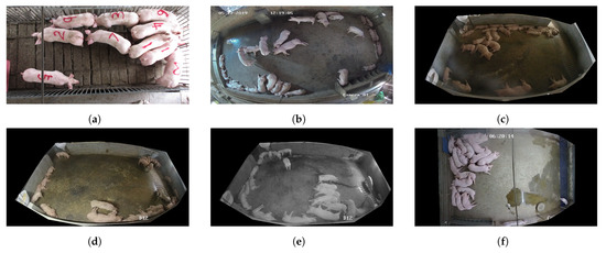 Count1200 is an instance segmentation dataset primarily designed for the problem of pig counting. The dataset comprises 1220 images, encompassing situations from various scenarios, including different times of day and varying lighting conditions. We collect images from the Internet and take pictures at the livestock farm, representing 75% and 25% of the total number of images, respectively, consisting of situations of small-scale objects (Figure 1c,d), occlusion between pigs and other obstructions such as beams and feeding troughs (Figure 1a,f), overlapping or clustering among pigs (Figure 1e,f), and low-light challenges posed by nighttime perspectives (Figure 1e); this enables our dataset to possess diversity and robustness. Considering the need for multi-scale counting, the data we collected include 9–28 pigs per image.