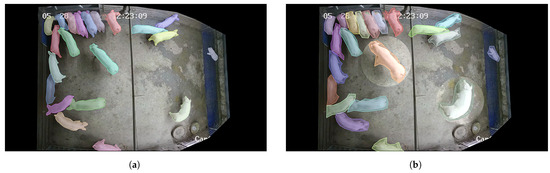 We successfully leverage the features above to develop a semi-auto instance labeling tool named SAI with a convenient GUI. With just left and right clicks, we can generate a mask in 5 s, which is seven times faster than manual annotation. The comparison of the two methods is illustrated in Figure 3. As opposed to the manual annotation with coarse-grained contour, the mask produced by SAI seamlessly fits around the objects, which helps models to separate pigs and background quickly and allows the feature of instances to be extracted efficiently without interference from irrelevant information, as shown in Figure 3a,b.