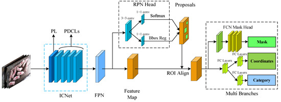 Deviating from the traditional pipeline of Mask-RCNN using ResNet [26] as a feature-extracting module, we suggest ICNet as a more robust and appropriate backbone for instance segmentation tasks (the area outlined by the blue dashed box in Figure 3). The details of ICNet are illustrated in Figure 5.
