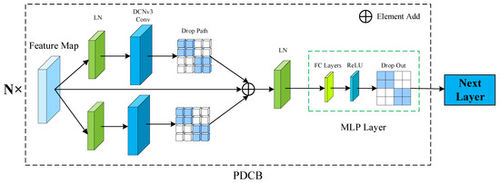 In order to achieve a balance between performance and resources consumption, a dual-branch structure is developed by us, whose core operation is DCNv3 that occurs after and before a drop path layer [31]. In our experiment, layer normalization exhibits strong adaptability with DCNv3 and we make good use of this feature to build our basic block. Compared to the basic block in InternImage [23], our PDCB uses less parameters to achieve a better performance owing to the creative unities of double branches features and skip-connection [26]. The dual-branch blocks can be depicted as Formula (4):