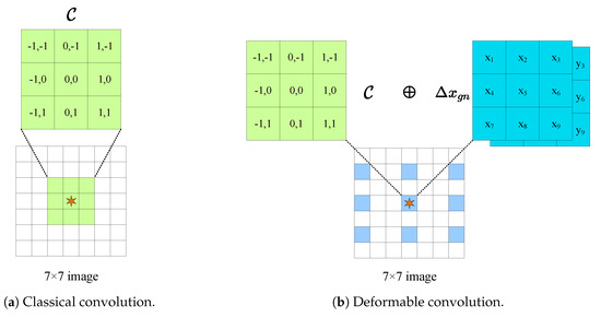 Deformable Convolutions was created in 2017 by Jifeng Dai [33] and further improved by Xizhou Zhu in 2019 [34]. It has been frequently used in instance segmentation and object detection-related tasks, since it has an irregular convolution shape, which allows a more flexible range of receptive fields when scanning images. Owing to the advantages listed above, deformable convolution is adapted to this work with the aim of achieving multi-scale detection of targets.