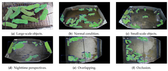 Visualization results of test set including different situations based on Mask R-CNN. The numbers on pigs of subfigure (a) represent the identifiers of pigs.