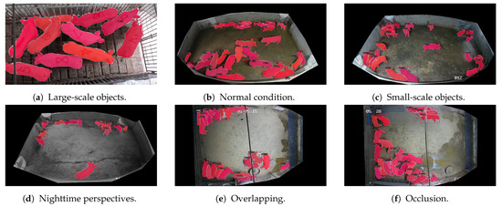 We select scenes with multi scales and different lighting intensities. The visualization results of Mask R-CNN are shown in Figure 8, showcasing issues such as repeatedly segmenting the same pig, missing pigs and identifying the background as pigs, which is a undesirable situation for detection and counting purposes. Owing to its close accuracy compared with ours, as shown in Figure 9, InternImage exhibits similar detection performance on large-scale targets to ours, such as in the clear segmentation results in Figure 9a. In addition, when facing scenes with a large number of objects, InternImage may fail to count a significant number of pigs, as illustrated in Figure 9b,d. Compared to the rough detection results of Mask R-CNN and the coarse-grained segmentation results of InternImage, the masks we produce almost seamlessly fit the pigs and can still be effectively recognized even when the pigs overlap. We can even accurately segment pigs when they are obstructed by objects such as the iron pipes in Figure 10a,e,f. Besides, there are few cases of missed or incorrect detections, which are consistent with the results in the Table 3.