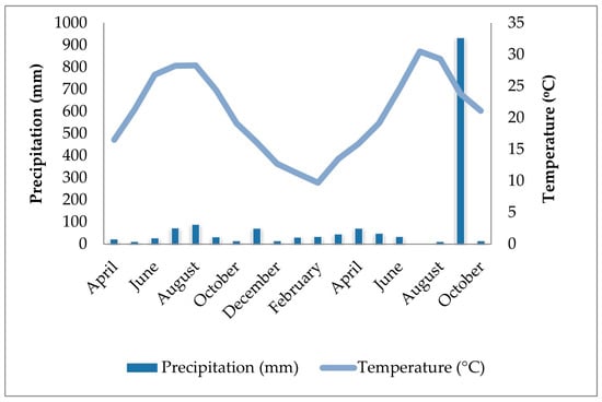 Figure 1. Air temperature and total precipitation during the studied period (April 2022–October 2023).