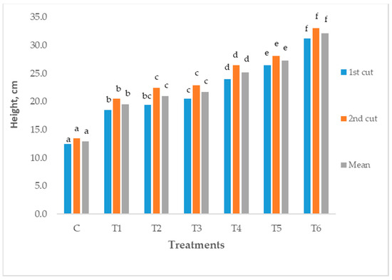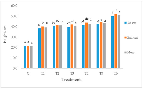 Plant height data are illustrated in Figure 2 (1st year) and Figure 3 (2nd year), revealing noteworthy trends. Across different pH soil treatments, the mean plant height ranged from 12.9 ± 0.06 to 32.2 ± 0.37 cm in the first year and expanded to 21.3 ± 0.74 to 51.0 ± 1.01 cm in the second year. Notably, over both study years, pots amended with 6% mussel shells consistently exhibited higher plant height, while the control treatment showed the lowest. Statistically significant differences emerged between treatment T6 and the others. In the first year, compared to the control, treatments T1, T2, T3, T4, T5, and T6 displayed increases of 33.7%, 38.2%, 40.4%, 48.7%, 52.6%, and 59.8%, respectively. Similarly, in the second year, the observed increments for the same treatments were 45.7%, 48.4%, 47.9%, 50.2%, 51.2%, and 58.2%.