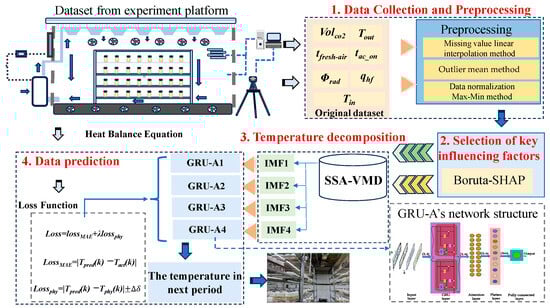 Therefore, there is an urgent need to explore a modeling method that uses existing knowledge rules as prior knowledge for deep learning models. The aim is to improve the model’s generalization performance and interpretability, while taking advantage of the massive data brought by the Internet of Things technology to overcome issues such as low prediction accuracy caused by complex features in the raw data. This article combines physical rules, data decomposition, and deep learning to form a comprehensive method. It aims to achieve high-precision temperature prediction of mushroom houses in extremely short periods, providing technical support for subsequent model predictive control methods. The novelty of this article lies in: