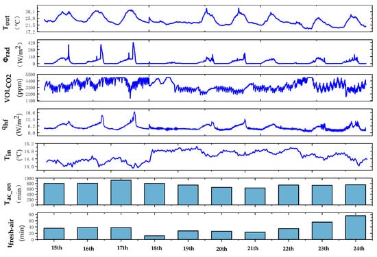 The experiment was conducted in a mushroom factory in Beijing, China. The collected data included outdoor temperature , solar radiation Φrad, air conditioning on duration tac_on, fresh air on duration tfresh-air, indoor CO2 concentration VolCO2, heat flux from outside to indoor qhf, and indoor temperature Tin. The data were collected from 12 May to 12 September 2022, with a 1 min interval. The data collection process can be referred to in ref. [33]. During the experiment, the upper and lower limits of the temperature in the mushroom room were set between 14 °C and 15 °C. For the convenience of display, data were selected from 15 August to 24 August. The duration of air conditioning operation was displayed in days, while the average indoor temperature was displayed in hours. The collection of all environmental data was illustrated in Figure 2.