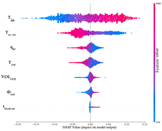 The previous temperature of the mushroom room had the most significant impact on the results among all the characteristics, followed by the duration of air conditioning. This is illustrated by the vertical sorting of the graph, which represents the ranking of the impact of a certain feature on the predicted temperature. The horizontal axis represents the magnitude of the impact of samples from different periods in a single feature on the predicted temperature. The color represents the size of feature values.