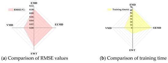 Comparison of predictive performance of models based on different decomposition modes: (a) comparison of RMSE values predicted by models under four decomposition modes; (b) comparison of training time for model prediction under four decomposition modes.