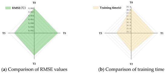 By comparing Figure 6a–d, it showed that excluding the duration of fresh air opening, R2 increased by 0.44% and 0.54%, respectively. Figure 7 showed that RMSE decreased by 1.67% and 3.45%, respectively, and the time was shortened by 0.3 and 0.5 s, respectively. This phenomenon arose due to the network’s acquisition of redundant features throughout the training process, leading to a certain level of overfitting. Consequently, this overfitting hampered prediction accuracy and escalated the computational complexity of the neural network.