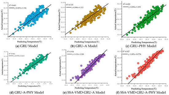 Comparison of R2 values based on different prediction modes: (a) GRU Model; (b) GRU–A Model; (c) GRU–PHY Model; (d) GRU-A-PHY Model; (e) SSA-VMD-GRU-A Model; (f) SSA-VMD-GRU-A-PHY Model.