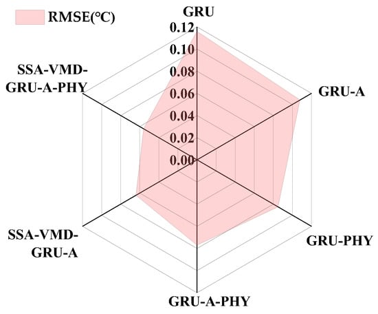 As shown in Figure 8 and Figure 9, the GRU–A model exhibited a 6.89% decrease in RMSE and a 6.4% increase in R2 compared to the GRU model. This improvement can be attributed to the effective enhancement of important feature weights through attention mechanisms, resulting in improved prediction accuracy. Compared with the GRU–A model, the SSA-VMD-GRU-A model predicts a 40.74% decrease in RMSE and a 24.34% increase in R2. These results highlighted the significant enhancement in prediction accuracy achieved by employing different hyperparameters for different modal components in deep learning prediction. To illustrate the advantages of introducing physical rules into the loss function of neural networks, the following performance comparisons were conducted. Compared with the GRU model, the GRU-PHY model predicted a 26.72% decrease in RMSE and a 21.37% increase in R2. Compared with the GRU–A model, the RMSE predicted by the GRU-A-PHY model decreased by 28.70% and the R2 increased by 18.43%. Compared with the GRU–A model, the GRU-A-PHY model predicted a 28.70% decrease in RMSE and an 18.43% increase in R2. Compared with the SSA-VMD-GRU-A model, the SSA-VMD-GRU-A-PHY model proposed in this paper predicted a 12.50% decrease in RMSE and a 2.5% increase in R2. These findings indicate that introducing physical rules based on thermal equilibrium into the loss function of neural networks can significantly enhance the predictive performance of the model.