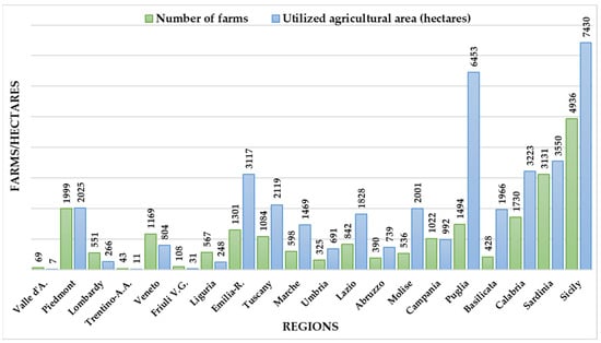As demonstrated by ISMEA (2013), a significant relationship exists between a farm’s UAA and the degree of specialization. Consequently, the identified farms were categorized into three classes of UAA (small, <10 ha; medium, 10–50 ha; large, >50 ha) and three classes of specialization, which were determined based on the percentage ratio between the area cultivated with MAPs and the farm’s total UAA (low, <13.4%; medium, 13.4–30%; high, >30%).