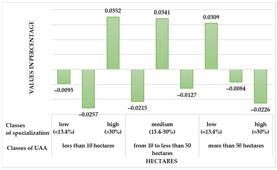- Farms with UAA ranging from 10 to 50 ha and a degree of specialization between 13.4% and 30% (medium-sized farms with a medium degree of specialization).