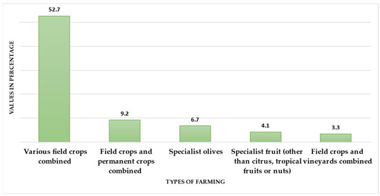 In the FADN sample, most of the MAPs are involved in mixed production systems. Out of the selected farms, over 75% belong to only five types of farming (TFs), with the “Various field crops combined” TF having the highest representation at 52.7% (Figure 4). Regarding small, highly specialized farms and medium-sized farms, with a moderate degree of specialization, the prevalence of the most represented TF increased significantly, exceeding 80%. Conversely, it decreased for large farms with low specialization (61%), where only five TFs have limited representation: “Permanent crops and grazing livestock combined”, “Specialist cereals (other than rice), oilseeds and protein crops”, “Field crops and vineyards combined”, and “Specialist quality wine” (each accounting for approximately 5–6% of the total representation).