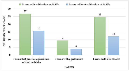 Based on the available data, the first piece of evidence is the complementary function of MAPs within production systems, which should be considered as part of business strategies aimed at diversifying the farm’s offer [6,14,61]. The proof of this is that MAP crops are frequently associated with more evolved business models oriented towards multifunctionality. Indeed, the comparison between the selected farms and the rest of the FADN sample shows that the frequency of farms that practice agriculture-related activities (Figure 5) is decidedly higher when there are cultivations of MAPs (27% versus the 16% found in the rest of the FADN sample). Even when considering agritourism alone, the difference is evident (9% versus 4%), but it is even more marked in the case of companies that rely on direct sales (25% versus 12%).