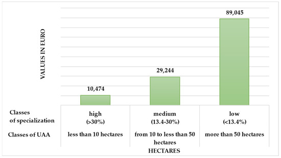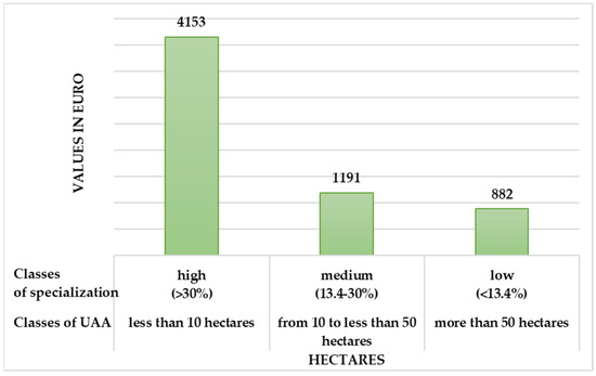 Concerning the FNI of the land (Figure 7), the best results were found in small, highly specialized farms (about EUR 4100 per ha). In comparison, they were considerably reduced as the UAA increased. The degree of specialization decreased (EUR 1200 and 800 per ha, respectively, in medium-sized farms with a medium degree of specialization and in large ones with a low degree of specialization).