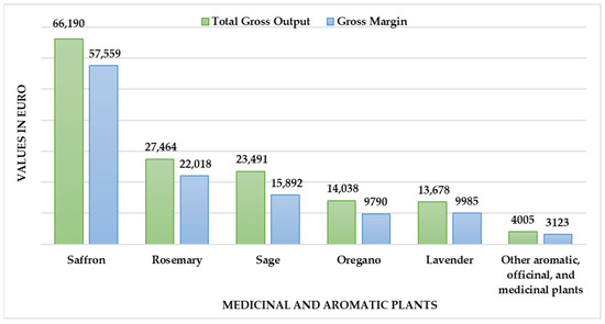 The examination of production values and crop costs yields a rather clear picture of the most profitable species within the Italian FADN sample (Figure 9). In particular, the TGO and the GM show the best performances in the case of saffron (66,200 EUR/hectare and 57,600 EUR/hectare, respectively), echoed by rosemary and sage with values equal to less than half of those achieved by saffron and, precisely, 27,500 EUR/hectare of TGO and 22,000 EUR/hectare of GM for rosemary and 23,500 EUR/hectare of TGO and 18,800 EUR/hectare of GM for sage. The results of the cultivation of oregano and those relating to the group “other aromatic, officinal, and medicinal plants” were decidedly more contained.