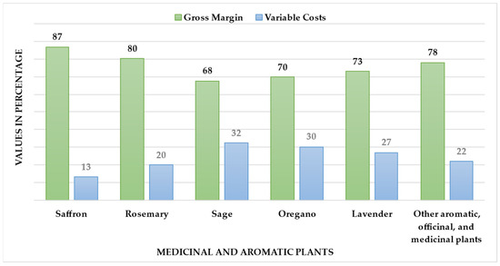 Although in absolute terms the VCs associated with saffron (about 8600 EUR/hectare) exceed those of the other crops, in relative terms, compared to the value of the TGO (13%), they are the lowest (Figure 10). It follows that the production process, which manages to retain 87% of the production value, appears to be the most efficient one. This is followed by the cultivation of rosemary, the GM of which equals 80% of the TGO, while in the other cases, this share settles on more modest values, falling into the range of 68–78%.