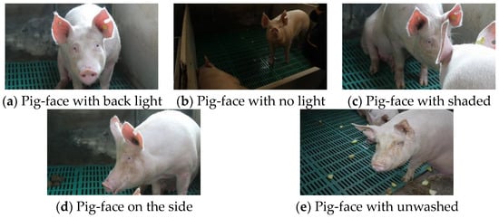 Another portion of the experimental data is derived from the public dataset of the JD Finance Pig Face Recognition Competition. This dataset consists of 30 videos corresponding to 30 pigs, with the duration of each pig’s video set at 1 min. Using OpenCV, we performed frame-by-frame processing on the captured video stream, extracting one image every 3 frames. In total, 41,313 photos were collected. Figure 2 illustrates the pig facial sample data collected in a complex environment.