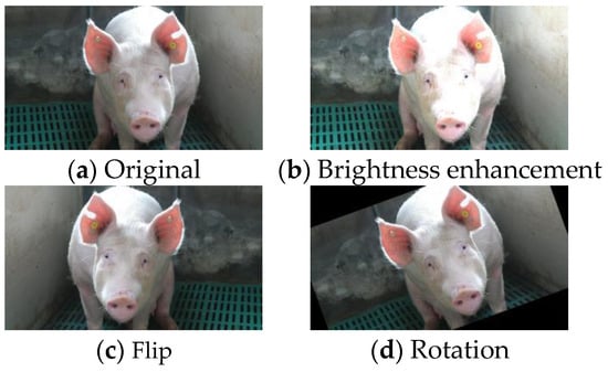 Data augmentation can be categorized into online and offline methods. To ensure effective model training, this study employs a combination of both online and offline data augmentation techniques. Online data augmentation involves augmenting data concurrently with model training. The advantage of this method lies in not requiring synthesized data, thereby saving storage space and offering high flexibility. Offline data augmentation involves enhancing and generating images prior to training the model. In this study, the training set of dataset A, featuring pig faces numbered 1–21 from Shanxi Agricultural University, was enriched using offline data augmentation techniques such as rotation, flipping, and brightness enhancement (Figure 3 and Figure 4).