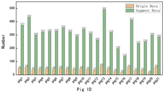 To address the challenge of excessive similarity among adjacent images in the split-frame intercepted dataset, we employed the Perceptual Hashing algorithm (p-hash) to filter out highly similar images. The p-hash algorithm generates a unique “fingerprint” string for each image, enabling the comparison of these fingerprints to determine image similarity—the closer the results—the more similar the images. This process involves transforming the image using Discrete Cosine Transform (DCT) to acquire the mean value of DCT coefficients and calculating image similarity based on these transform domain features. Moreover, even after the removal of highly similar images, the dataset still contains unusable data, such as images where the pig face is obscured, the image quality is poor, or the pig face is absent. Consequently, these data also require manual filtering.