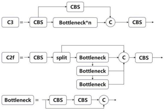 In its backbone architecture, YOLOv8 replaces YOLOv5’s C3 with the c2f module, thereby enhancing the capture of gradient flow information while maintaining a lightweight design. It dynamically adjusts channel numbers for different model scales, resulting in a significant improvement in model performance. In the Neck section, YOLOv8 eliminates the two convolutional connection layers in the PAN-FPN upsampling stage, choosing instead to directly input feature outputs from various backbone stages into the upsampling process. Simultaneously, the C3 module is replaced with the C2f module. Figure 6 provides a structural comparison diagram of C3 and C2f.