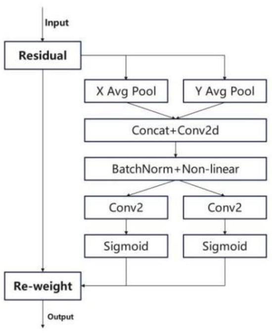 CA represents an efficient location-based attention mechanism [36]. Addressing the limitation of SE, which models channel relationships but overlooks location information, CA enhances this aspect. CA considers not just the inter-channel relationships but also incorporates direction-related location information. Additionally, CA enhances model accuracy with minimal computational overhead. Furthermore, the CA module’s flexibility and lightweight design allow for easy integration into the core modules of lightweight networks. Integrating CA into the YOLOv8 model enables the acquisition of cross-channel pig face features and long-range spatial dependencies. This approach also captures direction-aware and precise pig face positioning, thereby enhancing the focus on pig face feature learning and the extraction of multi-dimensional feature information within images. Figure 7 illustrates the structure of the CA module.