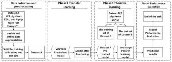 The study employs a two-stage transfer learning approach. The first stage involves training the model using the PASCAL VOC2012 dataset [40], an advanced version of the VOC2007 dataset. The VOC2012 dataset comprises 20 classes, with 11,530 images for training and validation and 27,450 annotated objects in regions of interest. The PASCAL VOC is renowned for its standardized datasets in image recognition and classification. The model was initialized using pre-trained weights derived from training on the VOC2012 dataset. The second stage focuses on training the collected pig face dataset. Transfer learning is applied to the weight file from the first stage, followed by model testing.