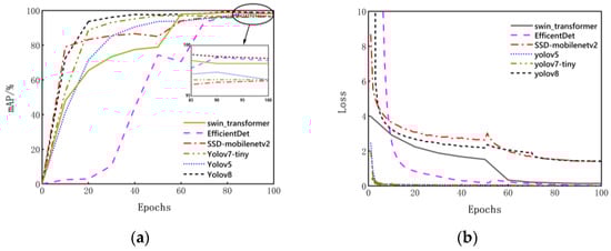 Curve of mAP and loss on validation set during training of different models (a) is curve of mAP. (b) is curve of loss.