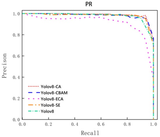 The precision–recall (PR) curve of YOLOv8-CA encompasses those of the other three attention mechanisms, signifying that YOLOv8-CA outperforms YOLOv8-CBAM, YOLOv8-ECA, and YOLOv8-SE, as illustrated in Figure 10. Notably, the area under the YOLOv8-CA curve is substantially larger than that of the YOLOv8 curve. This indicates that incorporating the CA mechanism into YOLOv8 enhances the model’s performance and increases its average precision in recognition tasks.