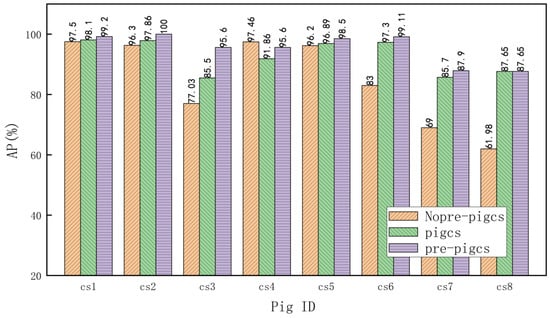 In trials involving eight pigs (Pigcs1–Pigcs8), a comparison was conducted among the backbone network (Nopre-pigcs), pre-trained weights (pigcs), and our two-stage trained weights (pre-pigcs). The mAP values were 84.81% for Nopre-pigcs, 92.60% for pigcs, and 95.73% for pre-pigcs, respectively. The two-stage model exhibited a 10.92% and 3.13% higher mAP value compared to the backbone network and pre-trained weights models, respectively, indicating enhanced recognition precision. Figure 11 displays the AP values for each pig when tested with the different models. Cs3 exhibited the largest increase in AP values, from 85.5% to 95.6%, while cs8 showed the smallest increase, with all AP values at 87.65%. The two-stage model demonstrated notable stability and generalizability.