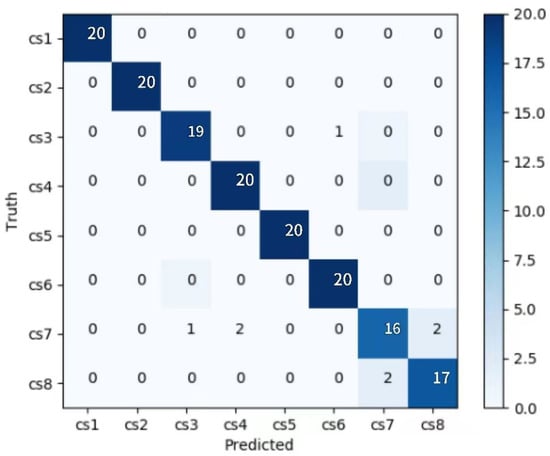 Figure 12 illustrates the confusion matrix of the two-stage model, with axis labels representing different pig IDs and matrix entries reflecting the count of recognized pig faces. For instance, a “1” in the matrix’s third column and second row signifies that the model once misidentified cs7 as cs3. The test results indicate that the model accurately recognizes most pig faces. Cs7 exhibited the poorest recognition performance, being most frequently misidentified as other pigs.