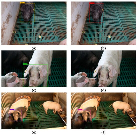 False recognition results of pig faces compared with two-stage models ((a,c,e) is the two-stage model correct recognition result graph, (b,d,f) is other model error recognition result map).