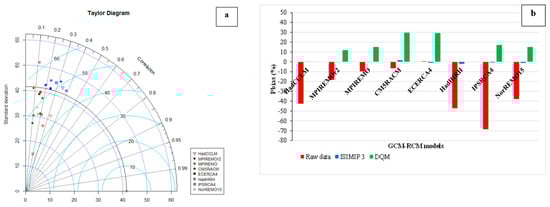 Figure 1a presents the performances of GCM-RCM models output, after bias correction using two different methods, in reproducing monthly precipitation in the Cap-Bon region. As shown in the Taylor diagram, the BC methods and models present different patterns. Regarding BC methods, ISIMIP3 performs better than the DQM method in reducing monthly precipitation bias for all the studied model combinations. Further analysis of the Taylor diagram shows that most of the bias-corrected data using the DQM method are worse than those obtained from the raw data. In the same context, Lange et al. [], compared the performance of ISIMIP2b and ISIMIP3 bias correction methods in adjusting biases in climate model outputs. Their results revealed that, for all studied climate variables, the ISIMIP3 bias correction method performs better than the ISIMIP2b method in adjusting the bias for the majority of months and grid cells. In addition, Casanueva et al. [], in an assessment of eight bias adjustment methods, found that the DQM shows a significant deviation from the raw trend for rainfall frequency. However, ISIMIP3 could preserve the model’s raw signals for the different indices and variables. Therefore, the HadHIRH model using the ISIMIP3 bias correction method followed by the HadCCLM model yielded better results for monthly P estimations. Their corresponding R, σ criteria were improved compared to raw data. Nevertheless, the CRMSE was not significantly improved.