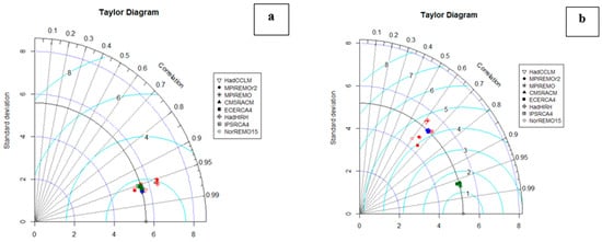Taylor diagram for comparison between performances of GCM-RCM model outputs, after bias correction using two different methods, in reproducing monthly maximum (a); and minimum (b) air temperatures in the Cap-Bon region.