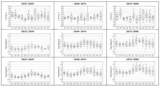 Precipitation, minimum and maximum air temperatures obtained from each GCM-RCM for the whole projected period, 2025–2098, were grouped into three time intervals (2025–2049, 2050–2074, 2075–2098). The change rates were determined compared to the reference period 1980–2005 (Figure 3).